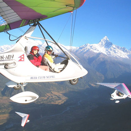 Ultra light aircraft take off from Pokhara airport and offer spectacular views of the lakes